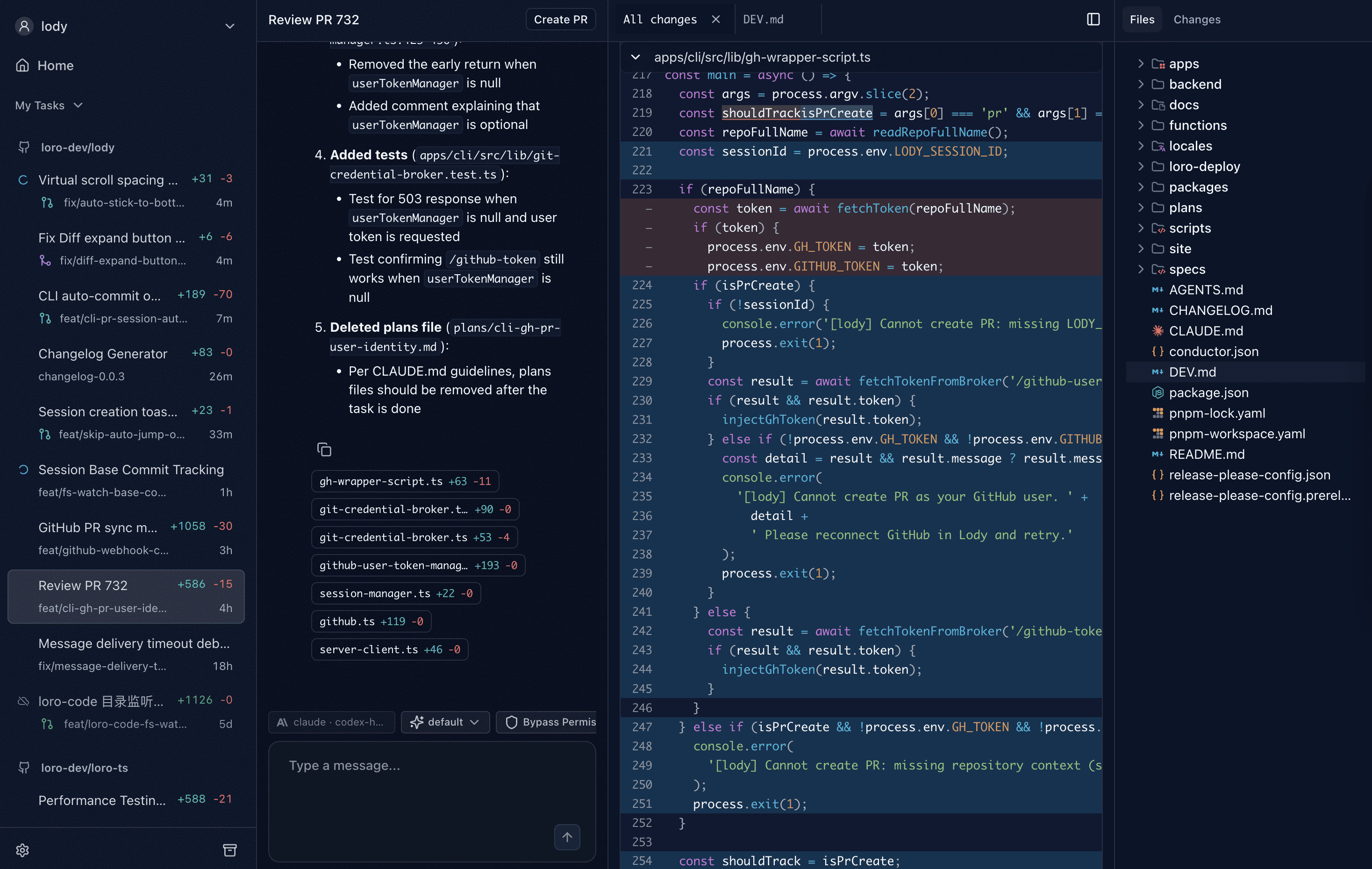 - At the end of each chat, Lody summarizes all file changes and line deltas, and you can click to view the diff.