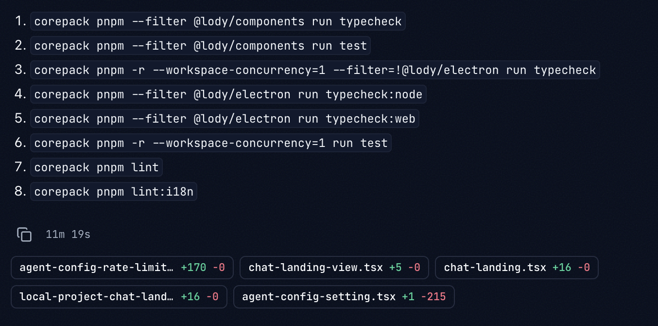 When you ask AI to edit code and modify files, Lody compares the file state before and after that conversation round. At the end of the round, it shows all file changes and changed line counts below the coding agent message bubble.
