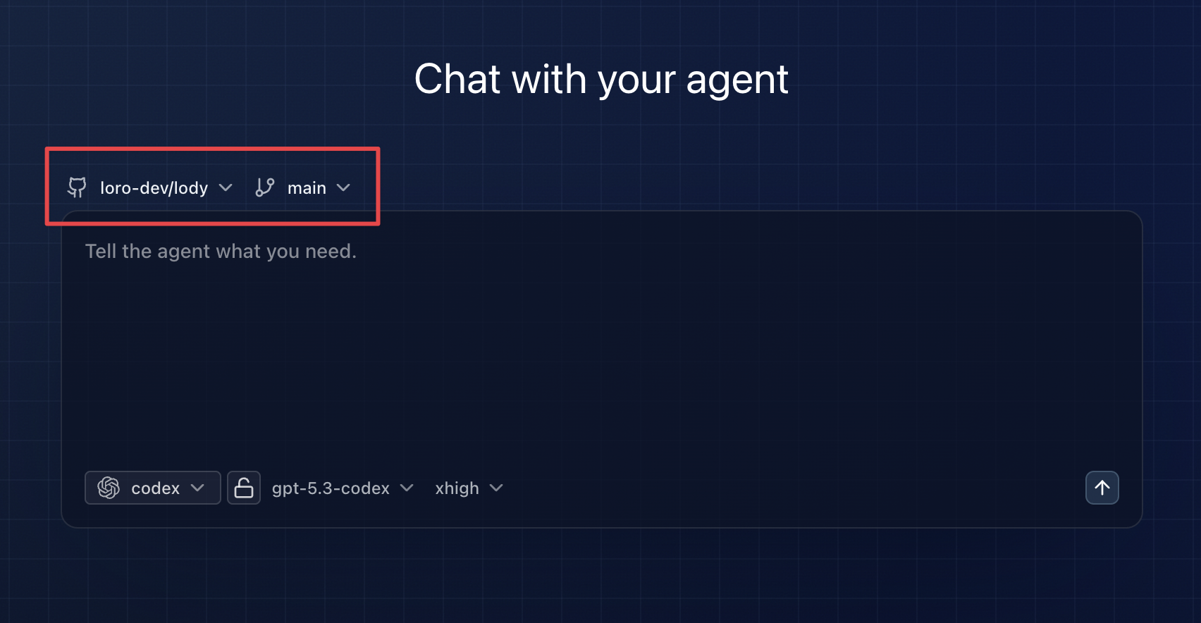 On the home page, use the repository selector at the top-left of the composer to choose a repository that was added to the workspace. Lody then lists branches in that repository so you can choose where to start.